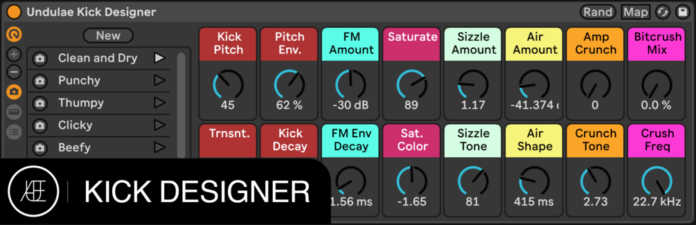 Kick Designer is an instrument rack for Ableton Live containing an instance of Operator and a handful of effects. The macro controls have been carefully dialed in to give the instrument a huge sweet spot, letting you quickly whip up your own kick drums without getting hung up on the minutiae of sound design.