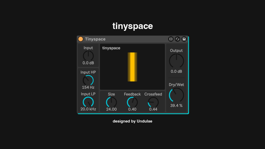 Tinyspace is a small, primitive reverb. It’s not something you would use to simulate big, lush spaces. It’s much more useful for generating metallic, jangly, resonant sounds, or for adding really short diffusion to give tight, mono percussive sounds a subtle sense of depth without losing their punch. It lets you get into those spaces that a lot of reverbs don’t let you.